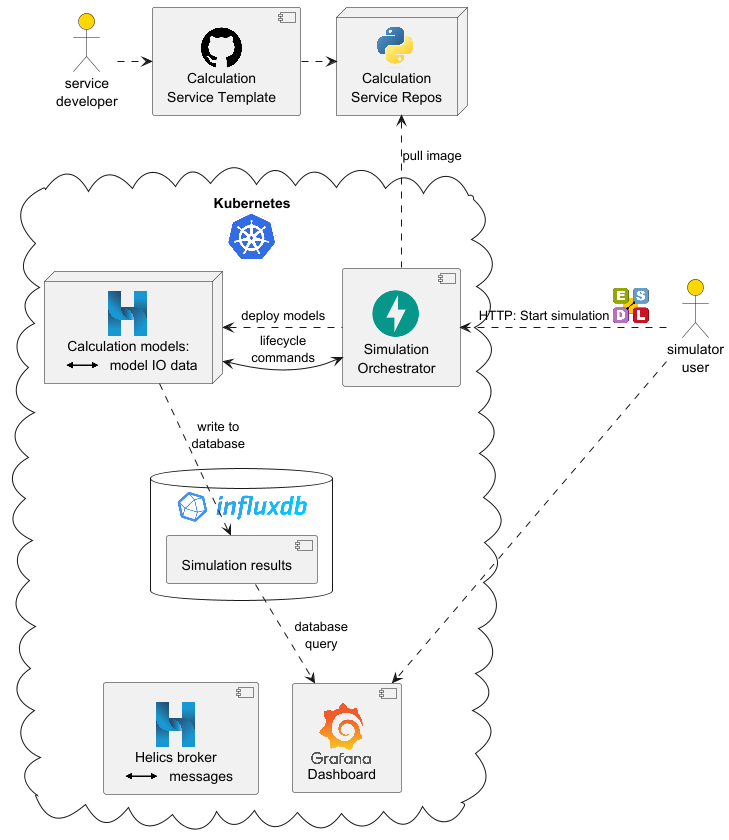 DOTS maakt de onafhankelijke ontwikkeling van rekenservices mogelijk voor specifieke energieobjecten of -diensten (bijv. PV-installatie, batterij, elektrische auto, weersvoorspelling, netbeheerder). De simulaties worden uitgevoerd op een (cloud)cluster en de resultaten worden opgeslagen in een