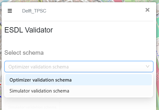 De ESDL Validator kan als losstaande component gebruikt worden, maar ook geintegreerd worden met de ESDL MapEditor. Indien de ESDL Validator vanuit de MapEditor aangeroepen wordt, kan de gebruiker ten eerste kiezen welk schema gebruikt moet worden voor de validatie