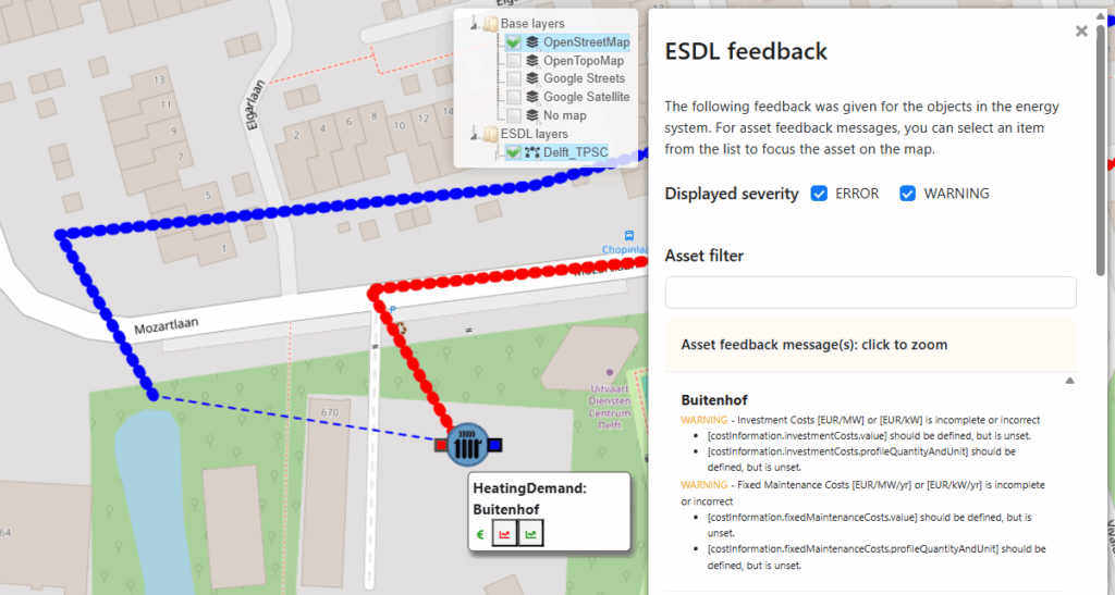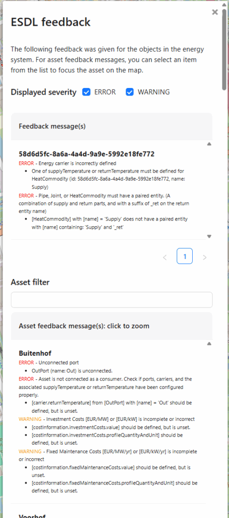 Na het runnen van de ESDL validator, krijgt de gebruiker vervolgens een nette lijst met feedback over waar de ESDL niet voldoet aan de regels in het validatie schema. De lijst is gesplitst in feedback over algemene informatie in de ESDL (bijvoorbeeld over de configuratie van energiedragers) en informatie per energie asset. Per element in de lijst wordt aangegeven, wat de ernst van de “overtreding” op de regel is.