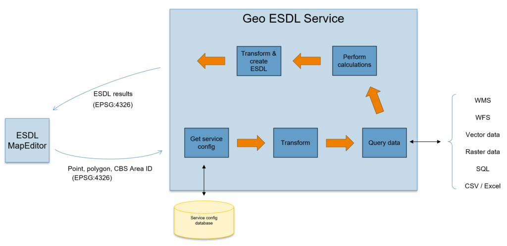 Wat er gebeurt als de Geo ESDL Service aangeroepen wordt, staat schematisch weergegeven in onderstaande figuur. In principe kan deze service ook zonder de ESDL MapEditor gebruikt worden.