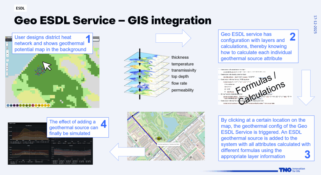 De eerste mogelijke toepassing betreft het toevoegen van een geothermiebron in de ESDL, waarbij de technische en economische specificaties van de geothermiebron bepaald worden op basis van kaartdata. De te volgen gebruikersworkflow wordt gevisualiseerd op onderstaande slide